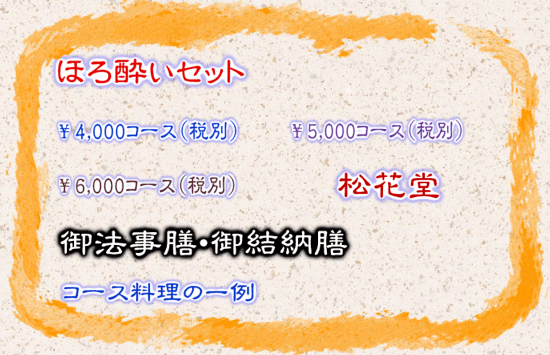 | ※お料理コースメニューはご予約にて承ります。下記以外にもご予算に応じてお造りいたします。 |